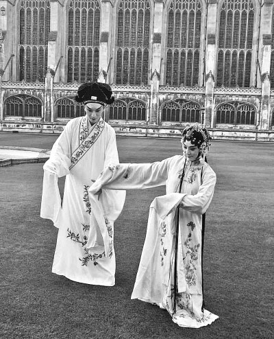 图为来自江苏的昆曲演员在剑桥大学国王学院草坪上起舞。林卫光摄/光明图片